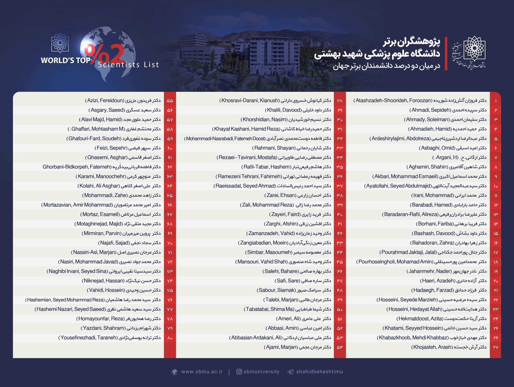 نام 80 نفر از اساتید و پژوهشگران دانشگاه علوم پزشکی شهید بهشتی در زمره پژوهشگران پراستناد 2 درصد جهان قرار گرفت.